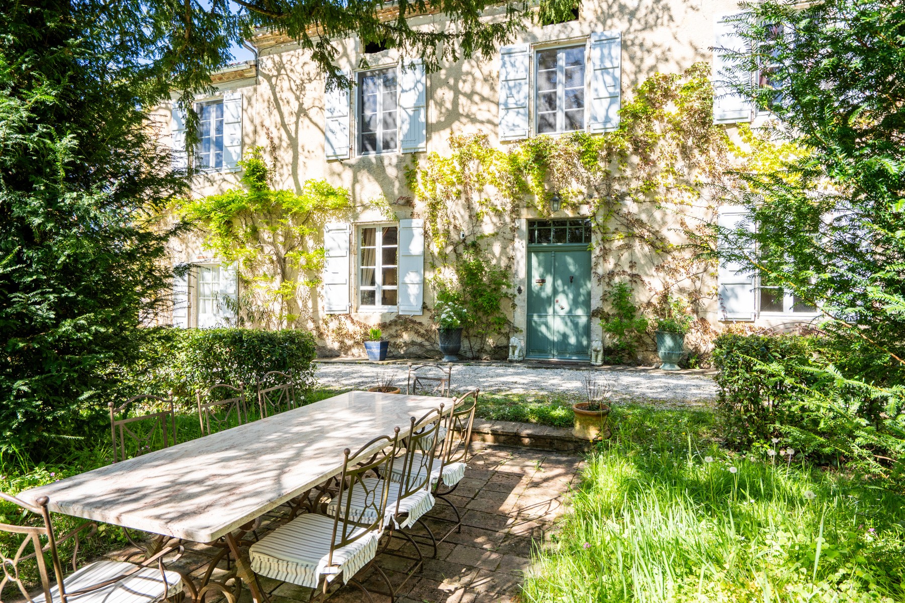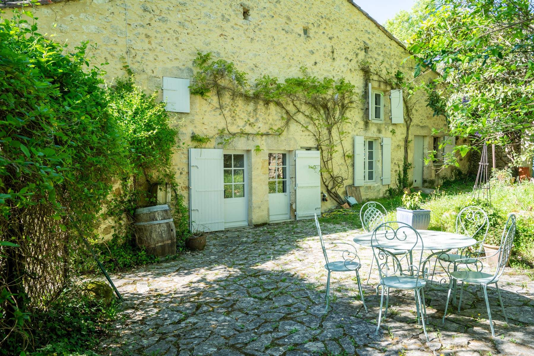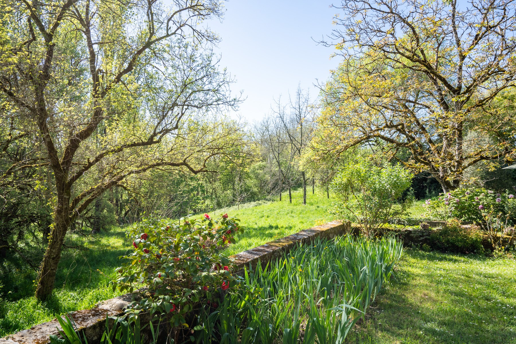 The garden features many mature trees and shrubs and a variety of quaint “garden rooms” all complemented by old limestone walls, one of which frames the pool and terrace, overlooking the small meadow and wooded area.